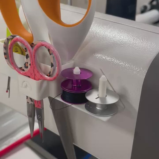 Designed to fit most long arm quilting machines, this holder attaches securely using an included Command Strip, keeping your scissors, bobbin, measuring tape, seam picker within arm’s reach while you work. Say goodbye to searching for these items mid-project!